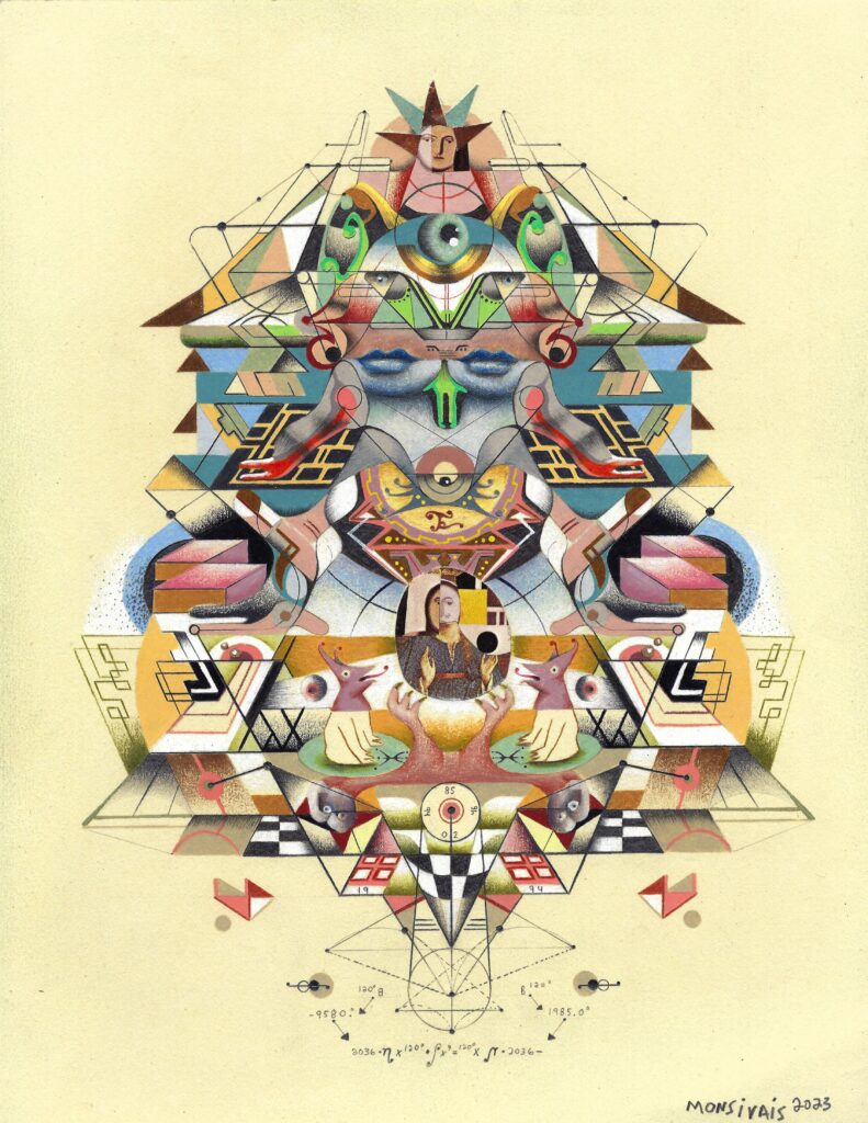 Space and lines influenced by music and architecture, mathematical equations and natural forms give us reason to examine the works of artists Jesus Monsivais & Scott Mossman. The intricate drawings of Monsivais chronicles a journey of a lost friend through a constructed paracosm, accompanied by mythical creatures. Though quite different visually, Mossman’s decidedly post-minimalist sculpture and maximalist painting share an emphasis on relationships – formal and contextual, that strive to expand the experience of space, and at the same time pose questions about nature. These two artists create work that coexists in one reality, yet take us to different dimensions.
